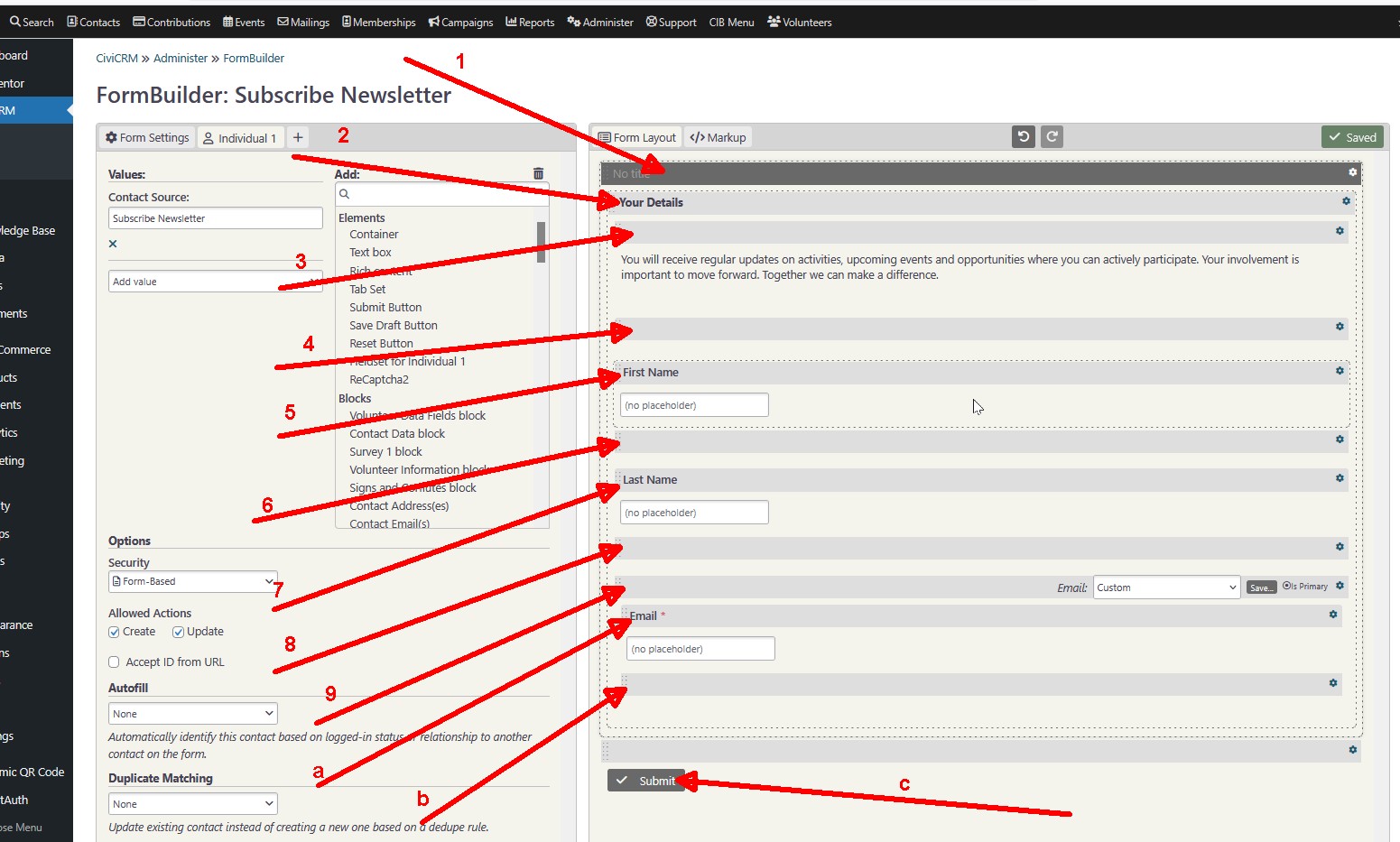 Once you save your form it is given a “afform name”, this is name you use to embed the form in any page.